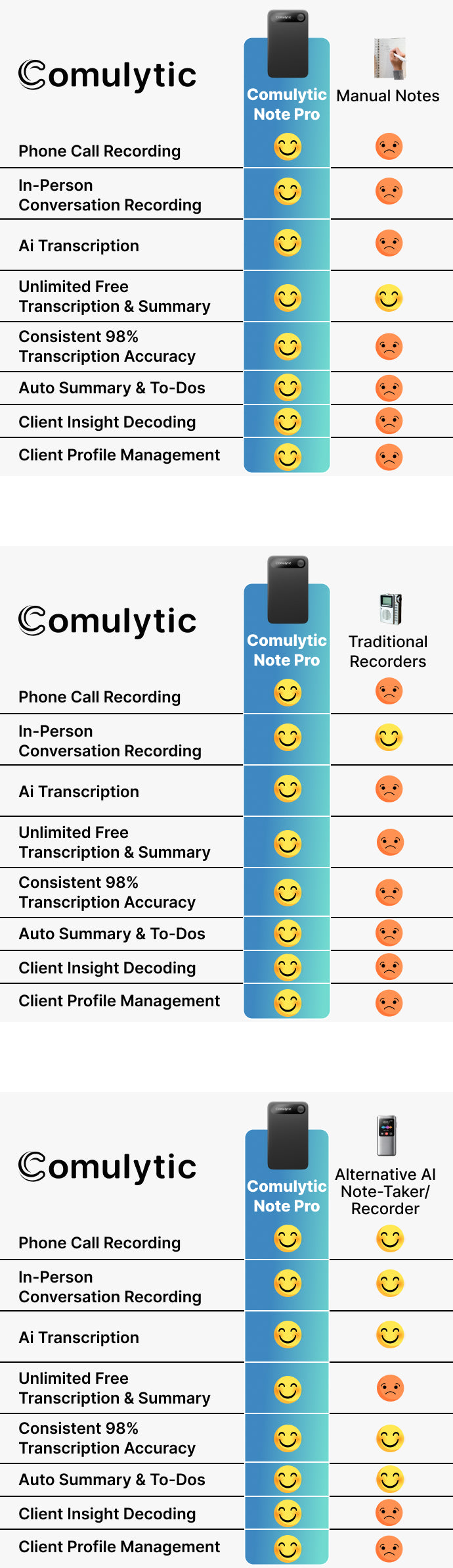 The Comulytic Note Pro is an AI Professional Engagement Assistant that automatically generates abstract and accurate transcripts while you record. It intelligently analyzes client needs, identifies opportunities and risks, and automatically builds manageable client profiles. Your phone's recorder only saves audio, leaving all the follow-up work for you to do manually.