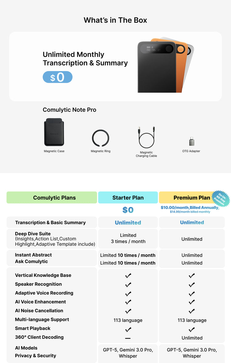 When you purchase the Comulytic Note Pro hardware, you receive full access to the core experience.