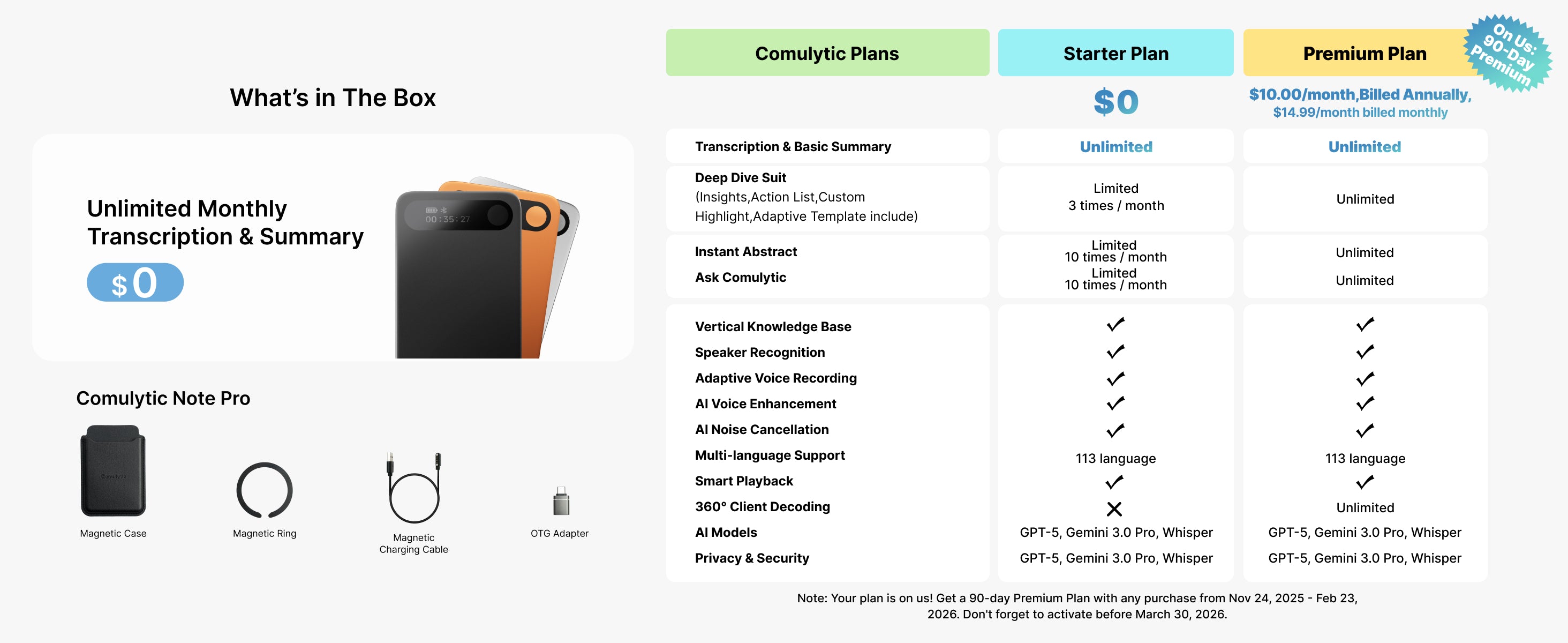 This includes: ① All hardware functionalities, ② Unlimited free transcription and basic summary services, and ③ Contact management features.